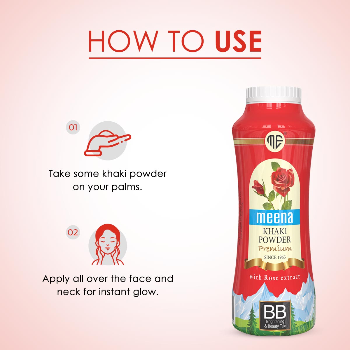 KHAKI POWDER:- Meena Khaki powder is the best and the most affordable form of foundation makeup. It is used to highlight facial features. It can directly tone the face to make your complexion even and smooth. It absorbs excess oil present on the skin and gives you a fresh look. This powder can be used by men and women both.