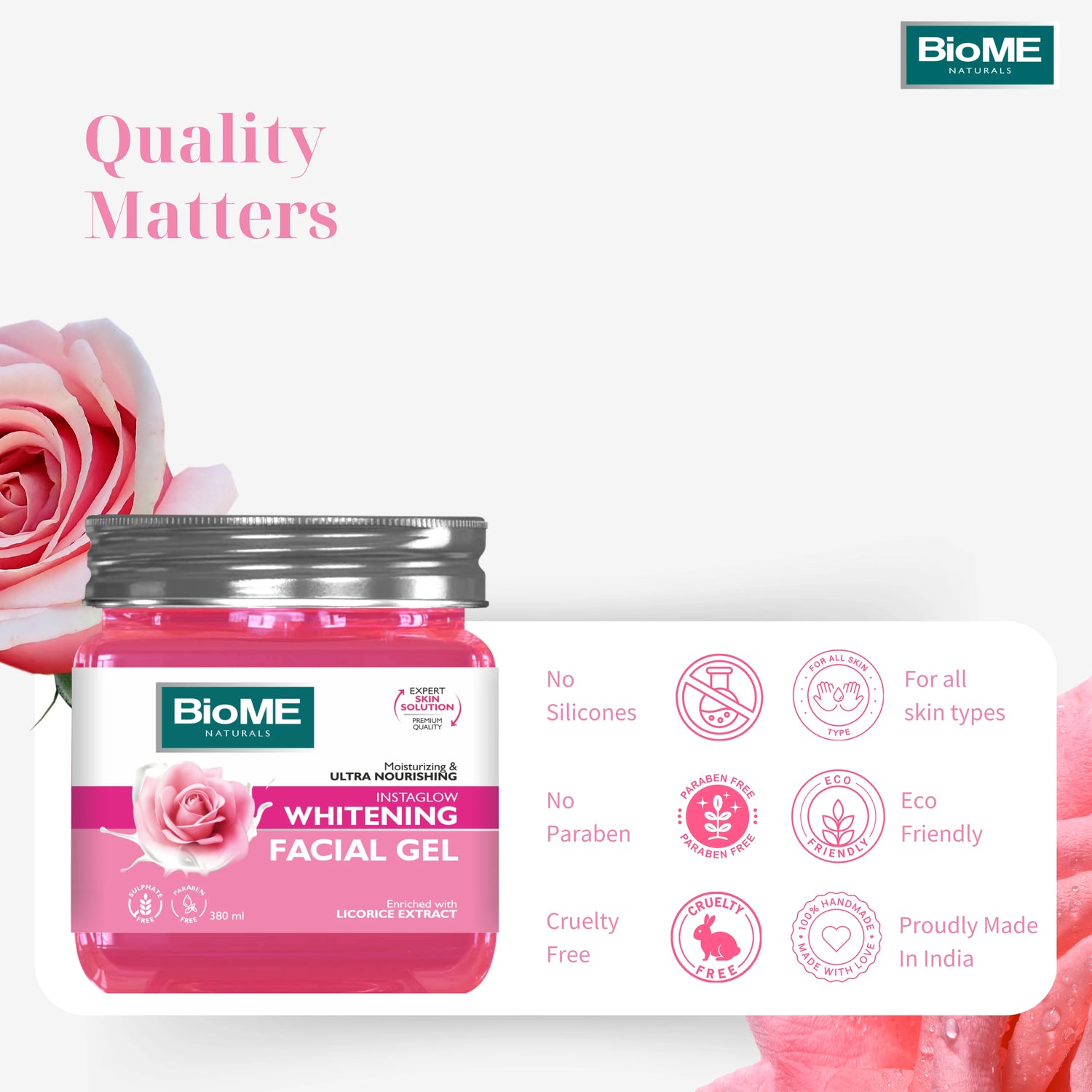 Biome Naturals Whitening Facial Gel helps fights dark spots, blemishes, and pigmentation while restoring your skin's protective barrier. This non- sticky, lightweight gel provides deep hydration, promoting an instant natural glow. Suitable for all skin types, it repairs visible damage, prevents premature aging, and reduces hyperpigmentation, leaving your skin bright, balanced, and blissfully radiant.
