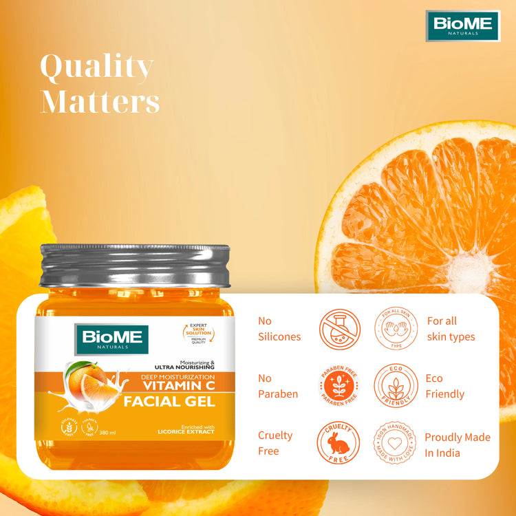 Biome Naturals Vitamin C Facial Gel helps repairs dead and damaged skin cells for restoring natural healthy glow. This Gel stimulates collagen production, combats oiliness, balance pH skin level for revealing natural glowing complexion. It reduce the effect of sun burn as well as soothes your skin. It helps lighten the skin tone, improve complexion dark spots & blemishes. It also helps reduce the sign of ageing like fine lines & wrinkles. Packed with antioxidants & helps aid the strengthening of skin’s defence system.