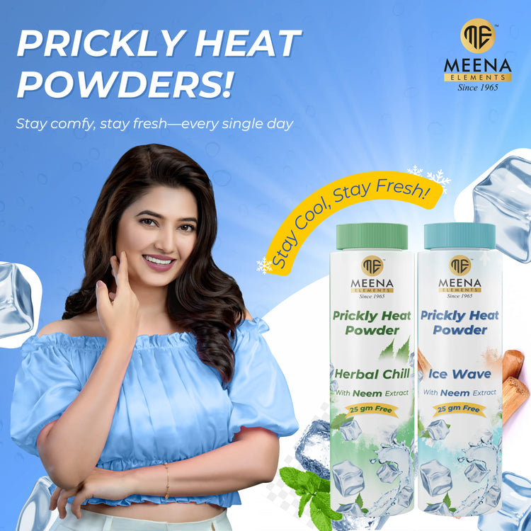 Experience the ultimate cooling sensation with Meena Elements Prickly Heat Powder – Ice Wave. Specially formulated with Menthol and Neem Extract, this variant offers an extra burst of freshness to combat prickly heat, rashes, and skin discomfort. Its light, sandalwood fragrance keeps you feeling cool and confident, even on the hottest days. Whether you’re battling summer heat or post-workout sweat, this powder is your go-to for instant relief and long-lasting comfort.