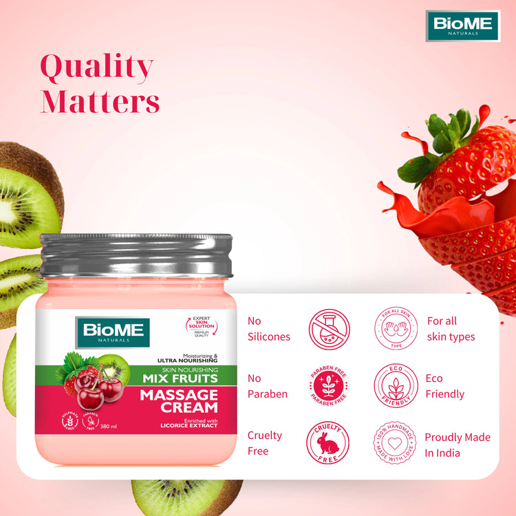 Biome Naturals Mix Fruits Massage Cream is designed to cater all your needs. With its key features, this cream is your secret to achieving a flawless complexion. Regular use not only enhances your skin's natural radiance but also offers a gentle exfoliating effect, leaving you with a renewed and revitalized appearance. Its deep moisturizing properties ensure your skin stays hydrated and soft, providing a lasting sense of comfort. Bid farewell to fine lines, scars, and blemishes as this cream effectively targets and reduces them, unveiling a smoother and more youthful complexion.