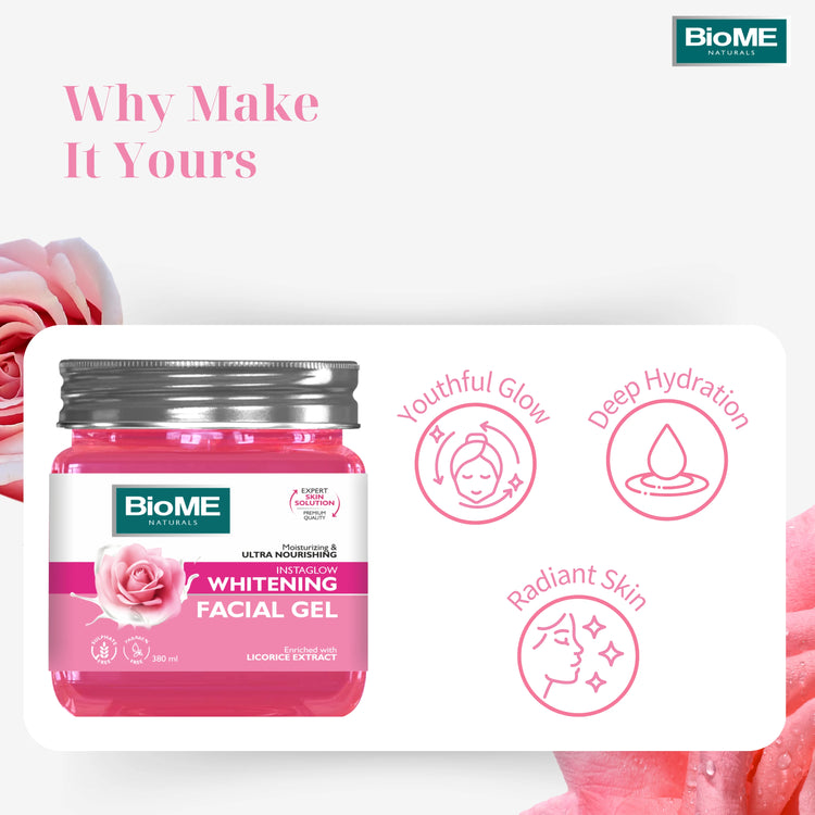 Biome Naturals Whitening Facial Gel helps fights dark spots, blemishes, and pigmentation while restoring your skin's protective barrier. This non- sticky, lightweight gel provides deep hydration, promoting an instant natural glow. Suitable for all skin types, it repairs visible damage, prevents premature aging, and reduces hyperpigmentation, leaving your skin bright, balanced, and blissfully radiant.