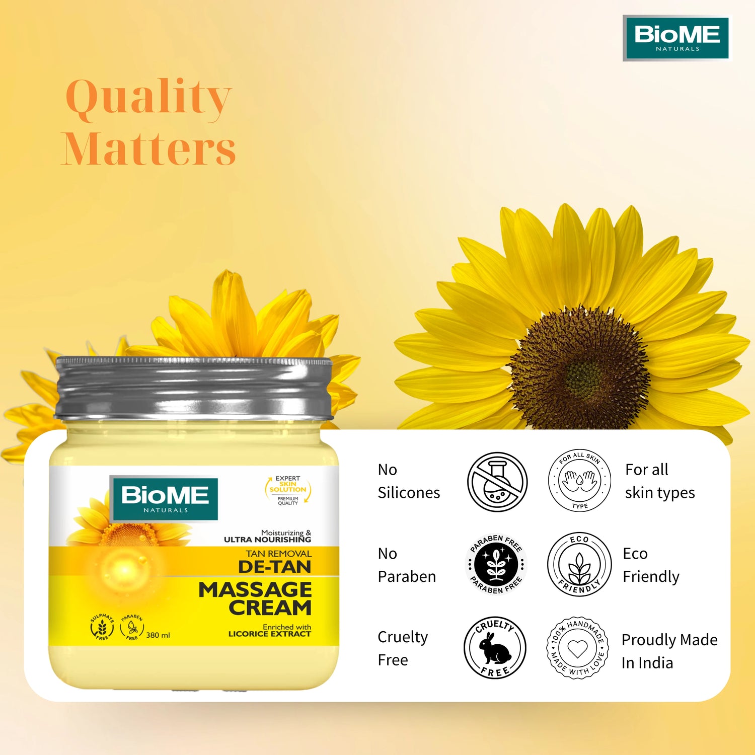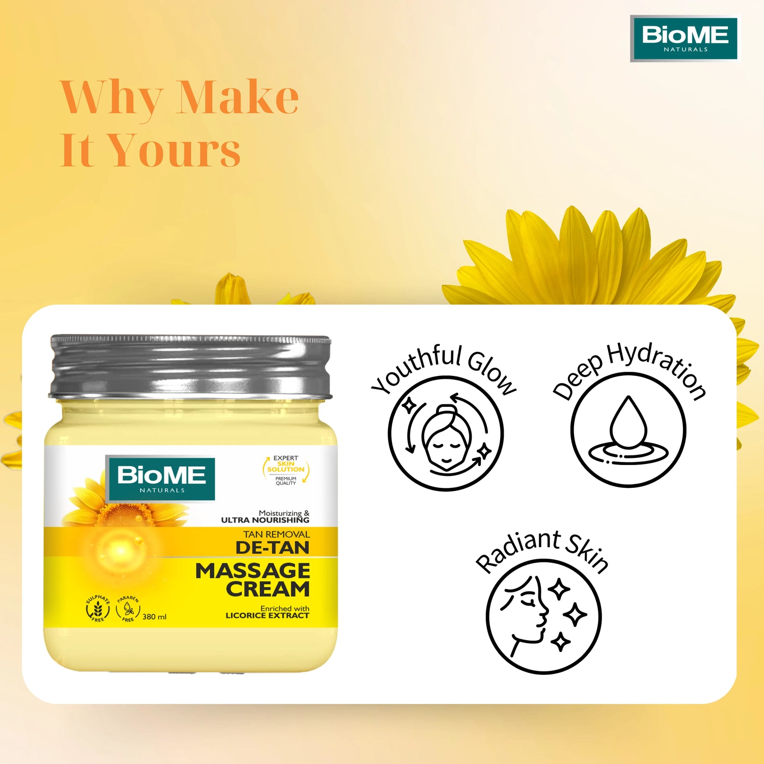 Biome Naturals De-Tan Massage Cream is the go-to solution to all your tanning problems. Say good bye to all pigmentation and skin tan caused due to over exposure to the sun. It is made from the best quality natural ingredients that acts as anti-oxidants and rejuvenates the skin providing instant lightening and brightening effect.