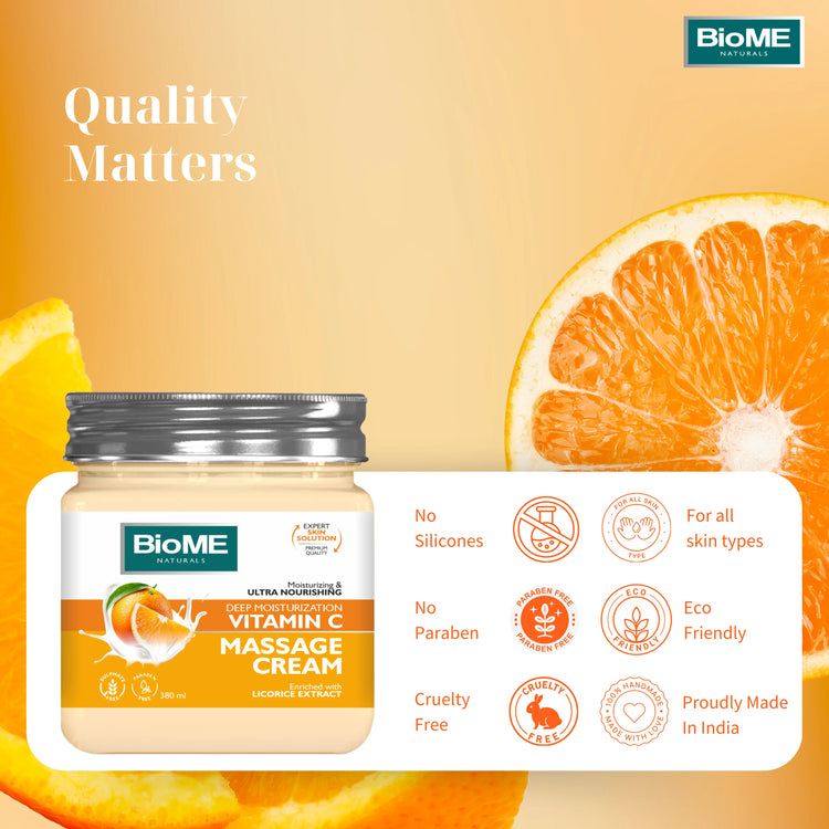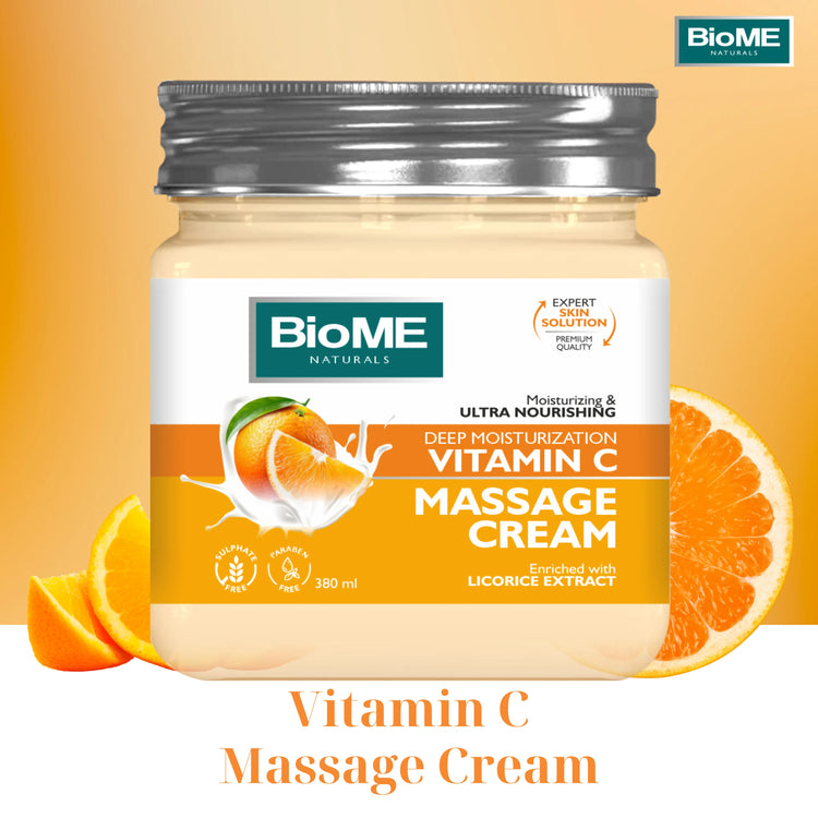 Biome Naturals Vitamin C Massage Cream is specially developed to give a better and lasting natural look on the skin with Vitamin C the added nourishing oils offer deep skin conditioning and softness to the skin. Gentle massage with this cream imparts a youthful effect, shiny texture and smooth tone to the skin is ideal for normal skin to dry skin dehydrated or rough skin texture.